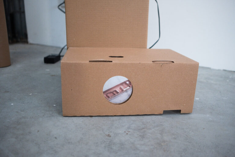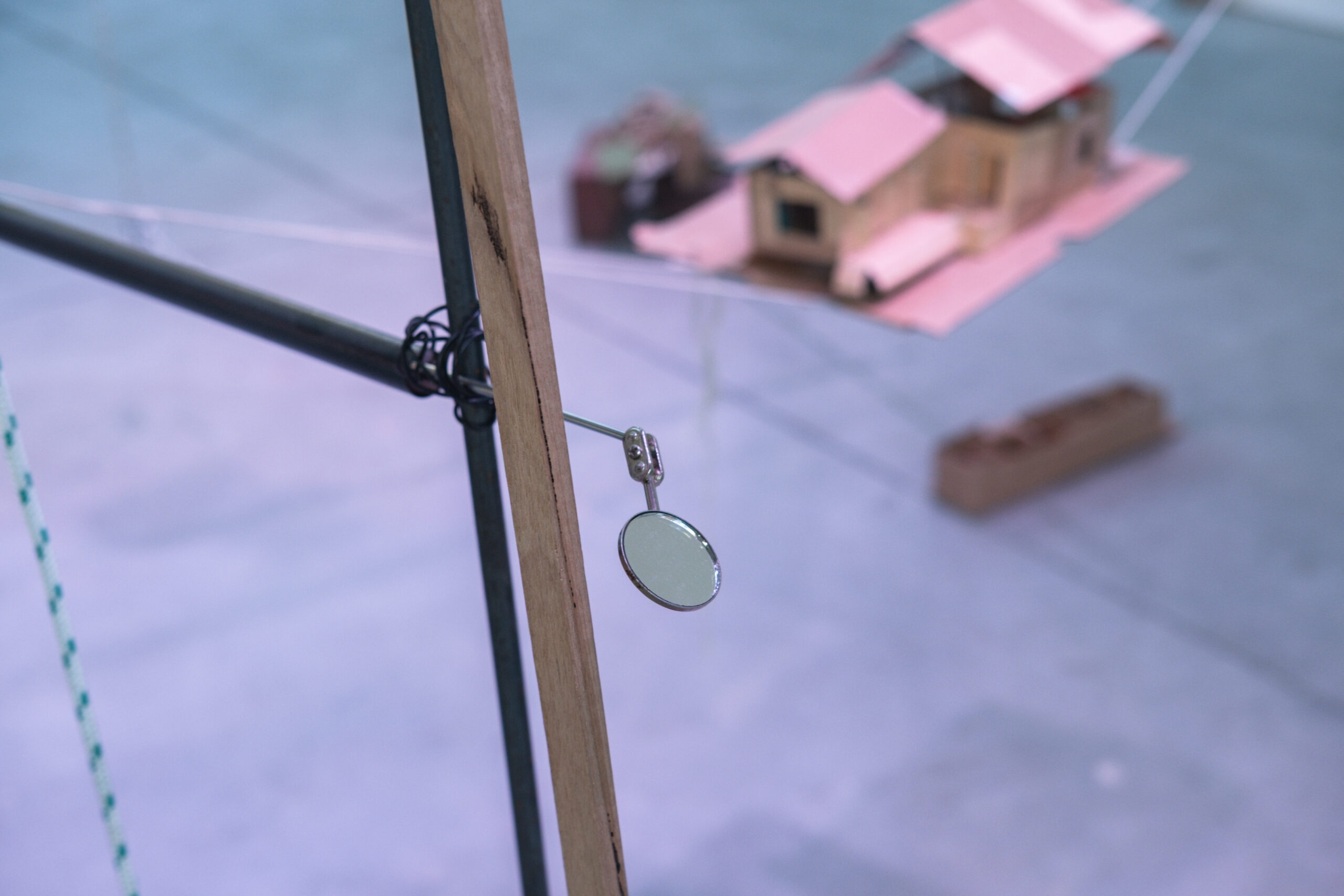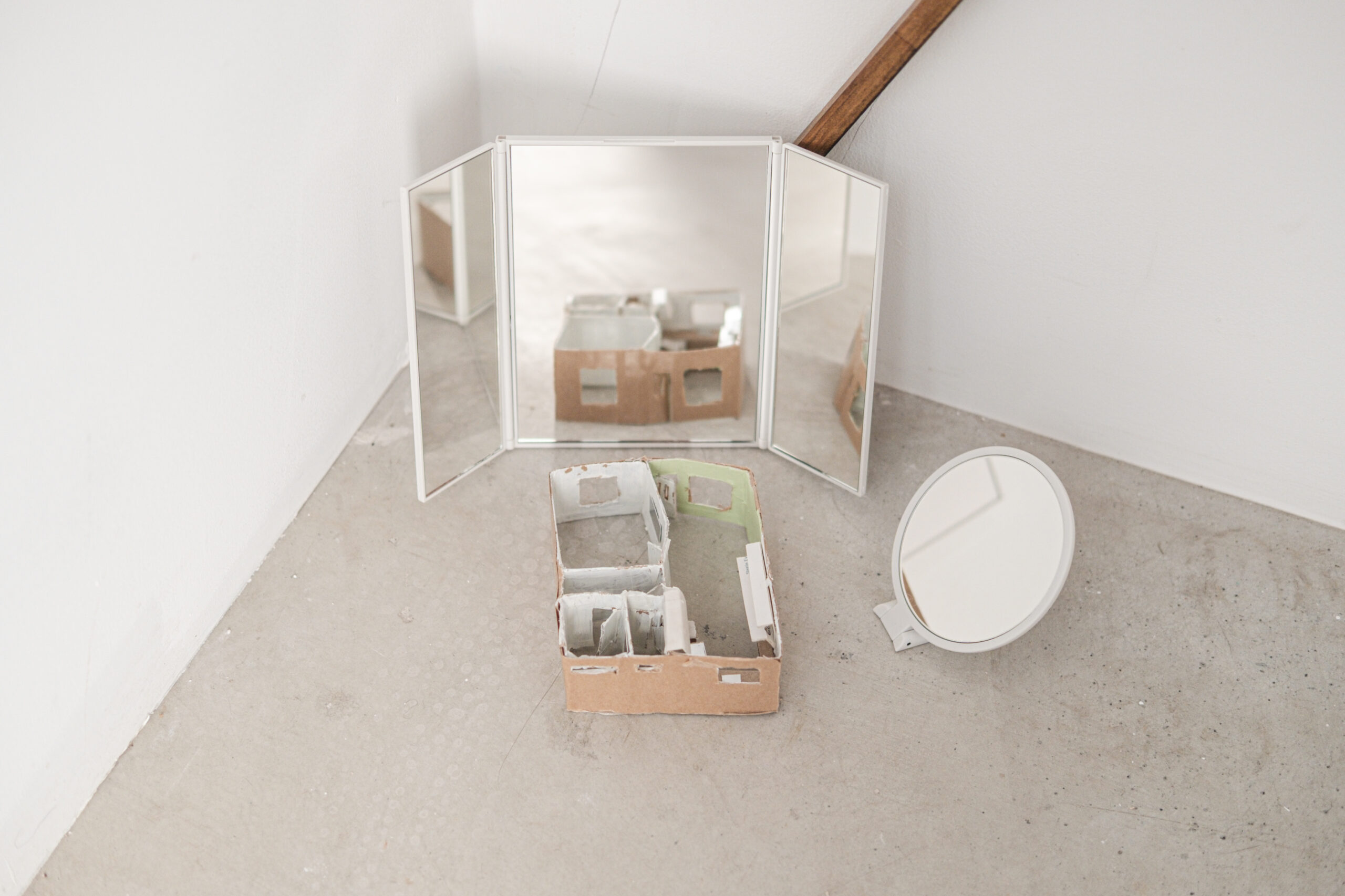 Enhance, Enhance, Enhance by Brigit Ryan is a mirrored installation that reconstructs memory and space through shifting reflections, evoking personal and architectural histories.